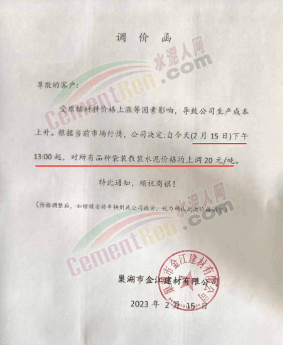 安徽巢湖金江建材通知,2月15日起對各品種袋裝,散裝水泥價格上調(diào)20元/噸。