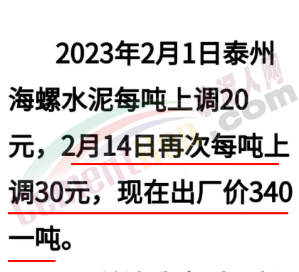 江蘇泰州海螺2月14日再上調(diào)30元/噸,本月內(nèi)兩次上調(diào),累計上調(diào)50元/噸,上調(diào)后出廠報價340元/噸。