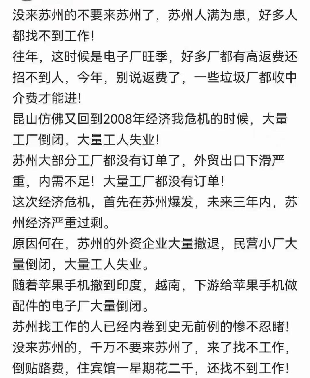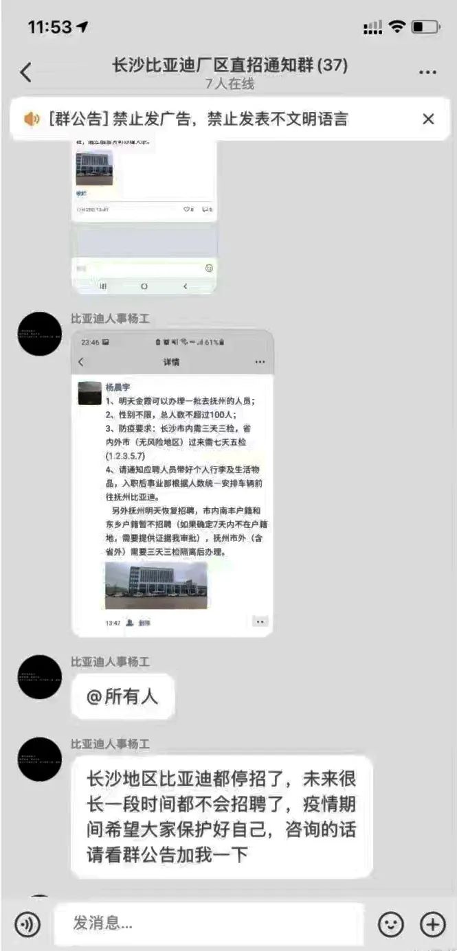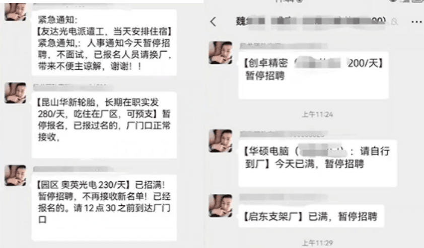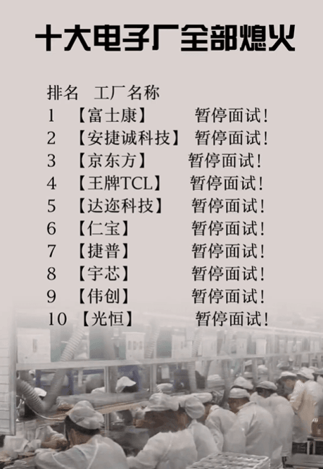 長(zhǎng)沙比亞迪全部停招,蘋果昌碩科技暫停招募代工,蘇州立訊已經(jīng)停招,成都5大工廠(富士康、京東方、仁寶、偉創(chuàng)、捷普)基本都已“熄火”,目前現(xiàn)在廠里都飽和了,要十幾個(gè)人,都能去一百多人。