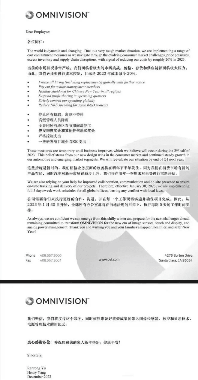 延續(xù)了近兩年的科技公司裁員潮和互聯(lián)網(wǎng)企業(yè)優(yōu)化潮仍在繼續(xù),2023年全球科技業(yè)宣布的裁員計(jì)劃總數(shù)目前已超過10萬人,接近2022年整年的裁員數(shù)量。美國(guó)芯片企業(yè)豪威集團(tuán)(OmniVisionGroup)預(yù)警,2023年市場(chǎng)需求不樂觀,運(yùn)營(yíng)將面臨極大的挑戰(zhàn),宣布采用停招、降薪等一系列措施控制成本,以使明年成本減少20%,并表示這些措施是暫時(shí)的,將在明年一季度末對(duì)形勢(shì)進(jìn)行重新評(píng)估。