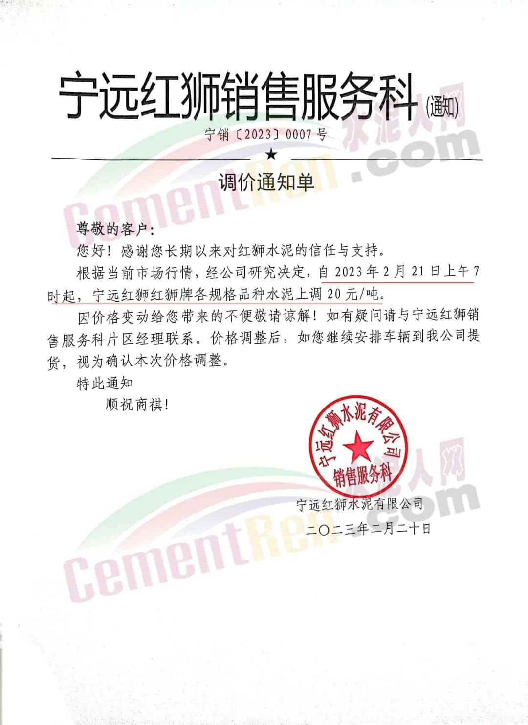 日前,寧遠(yuǎn)紅獅銷售服務(wù)科通知,根據(jù)當(dāng)前市場行情 ,經(jīng)公司研究決定自2月21日上午7時起,寧遠(yuǎn)紅獅紅獅牌各規(guī)格品種水泥上調(diào)20元/噸。
