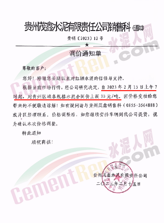紅獅水泥旗下貴州茂鑫水泥有限責(zé)任公司通知,2月15日上午7時起,對貴州區(qū)域各規(guī)格水泥合同價上調(diào)30元/噸。
