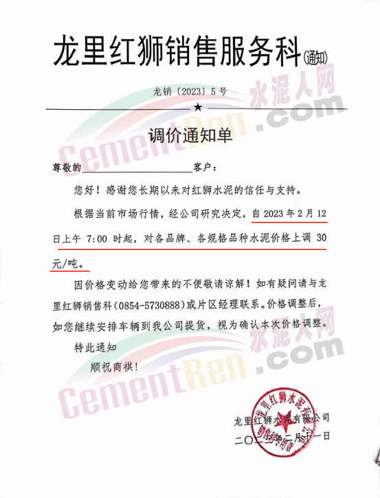 龍里紅獅水泥有限公司銷售服務(wù)科通知,自2月12日早上7時起,對各品牌、各規(guī)格品種水泥價格上調(diào)30元/噸。
