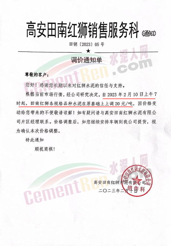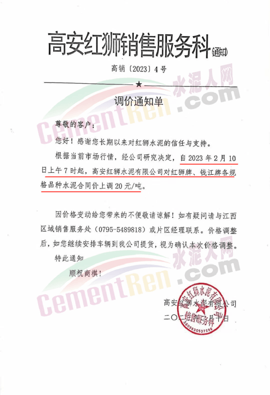 高安紅獅銷售服務(wù)科通知,2月10日上午7時起,高安紅獅水泥對紅獅牌、錢江牌各規(guī)格品種水泥合同價上調(diào)20元/噸。