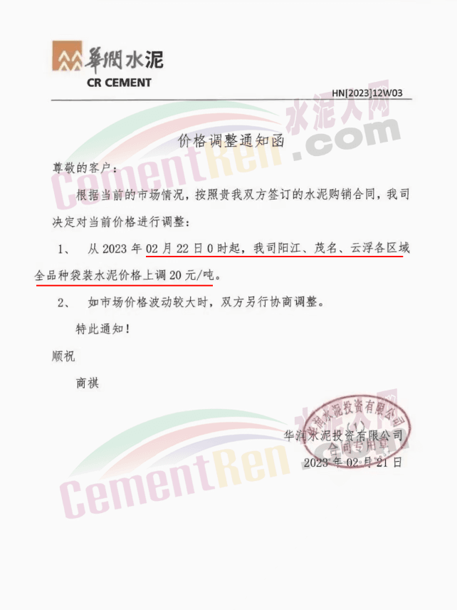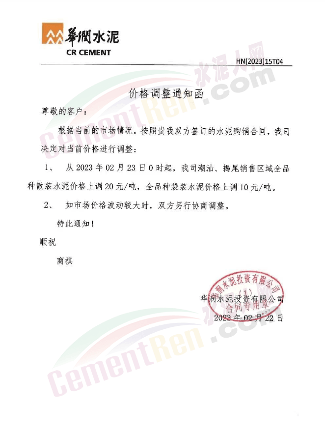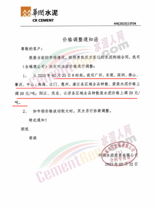 廣東區(qū)域華潤水泥投資有限公司從2023年2月23日0時起對發(fā)往以下的區(qū)域的水泥價格進行調(diào)整。