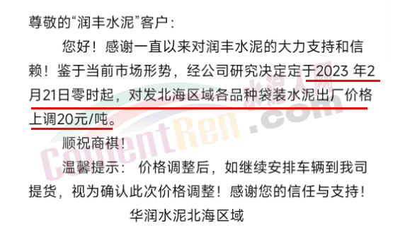 華潤水泥北海區(qū)域通知,2月21日零時起,對發(fā)北海各品種袋裝水泥出廠價格上調(diào)20元/噸。