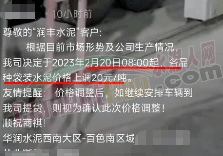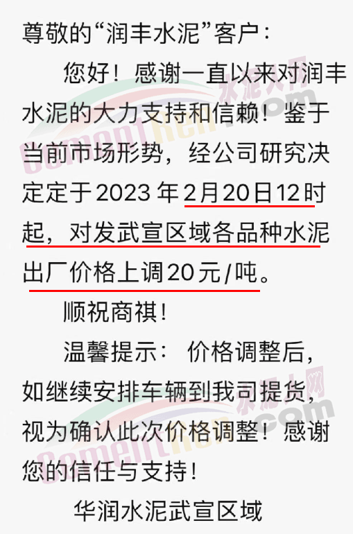 華潤水泥武宣區(qū)域通知,定于2月20日12時起,對發(fā)武宣區(qū)域各品種水泥出廠價格上調(diào)20元/噸。