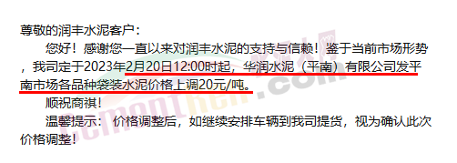 華潤水泥玉林銷售區(qū)通知,2月20日中午12時起,對玉林區(qū)域袋裝各品種水泥價格出廠價上調(diào)20元/噸。
