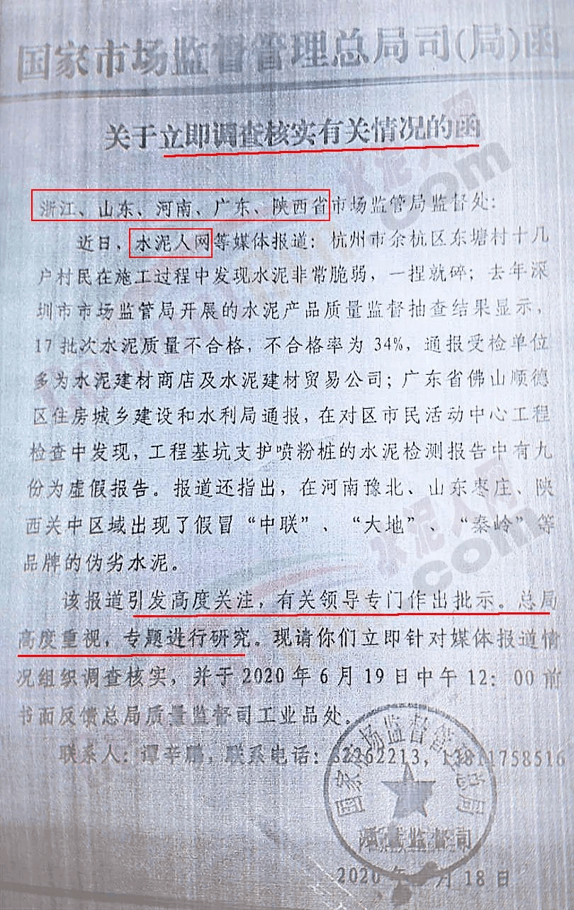 國(guó)家市場(chǎng)監(jiān)督管理總局以及各地市場(chǎng)監(jiān)督管理局對(duì)于水泥質(zhì)量萬(wàn)里行組委會(huì)活動(dòng)高度重視。2020年6月中旬,國(guó)家市場(chǎng)監(jiān)管總局發(fā)文給浙江、山東、河南、廣東、陜西等省市場(chǎng)監(jiān)管局監(jiān)督處稱,水泥人網(wǎng)相關(guān)報(bào)道中提及假冒偽劣水泥,引發(fā)高度關(guān)注,有關(guān)領(lǐng)導(dǎo)專門(mén)作出指示,總局高度重視,專題進(jìn)行研究。同時(shí),國(guó)家市場(chǎng)監(jiān)管總局、工信部等相關(guān)部門(mén)組成督查組進(jìn)駐相關(guān)省份,進(jìn)行實(shí)地督查。