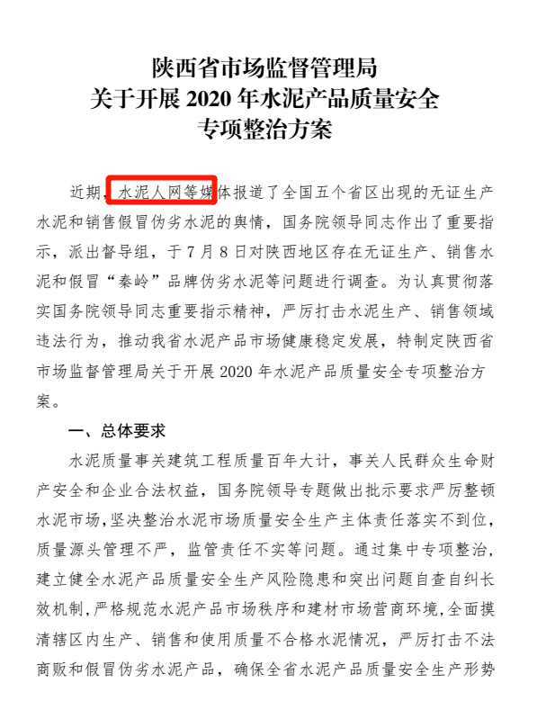 陜西省市場(chǎng)監(jiān)督管理局水泥產(chǎn)品質(zhì)量安全專項(xiàng)整治方案提到,水泥人網(wǎng)等媒體報(bào)道了全國(guó)五個(gè)省區(qū)出現(xiàn)的無(wú)證生產(chǎn)水泥和銷售假冒偽劣水泥的輿情,國(guó)務(wù)院領(lǐng)導(dǎo)同志作出了重要指示,派出督導(dǎo)組對(duì)陜西地區(qū)存在無(wú)證生產(chǎn)、銷售水泥和假冒品牌偽劣水泥等問(wèn)題進(jìn)行調(diào)查。為認(rèn)真貫徹落實(shí)國(guó)務(wù)院領(lǐng)導(dǎo)同志重要指示精神,嚴(yán)厲打擊水泥生產(chǎn)、銷售領(lǐng)域違法行為,推動(dòng)陜西省水泥產(chǎn)品市場(chǎng)健康穩(wěn)定發(fā)展,特制定水泥產(chǎn)品質(zhì)量安全專項(xiàng)整治方案。
