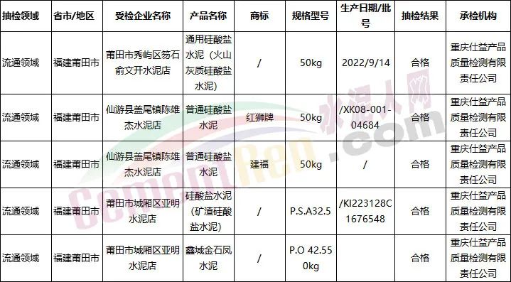 福建省莆田市2022年流通領(lǐng)域建材及裝飾裝修產(chǎn)品類商品質(zhì)量市級(jí)監(jiān)督抽查,水泥產(chǎn)品抽查5個(gè)批次全部合格。