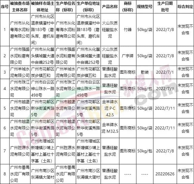 廣東省廣州市市場(chǎng)監(jiān)督管理局水泥產(chǎn)品質(zhì)量監(jiān)督抽查,共抽查了8批次樣品,經(jīng)檢驗(yàn)全部產(chǎn)品符合標(biāo)準(zhǔn)要求。
