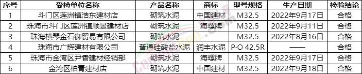 廣東省珠海市市場(chǎng)監(jiān)督管理局共抽查了6家企業(yè)銷售的6批次水泥產(chǎn)品。經(jīng)檢驗(yàn),未發(fā)現(xiàn)質(zhì)量不合格產(chǎn)品。