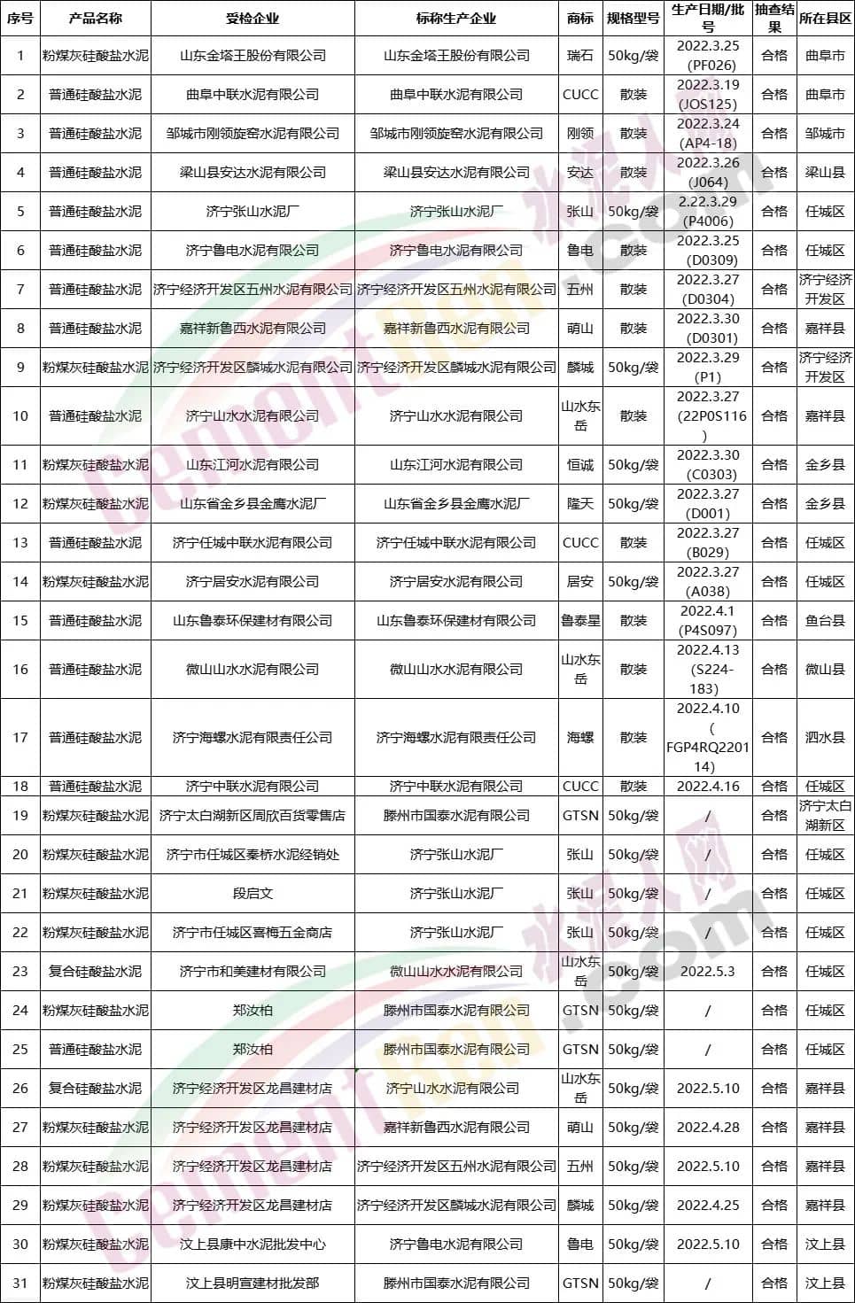 水泥人網(wǎng)注意到,山東濟(jì)南、濟(jì)寧兩市共抽查83批次水泥,全部合格。但是抽查時(shí)部分企業(yè)處于暫時(shí)停產(chǎn)狀態(tài),未抽到企業(yè)樣品。