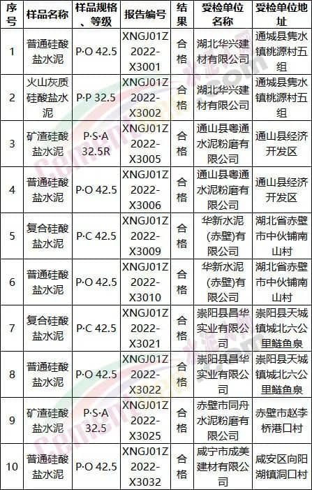 湖北省咸寧市市場(chǎng)監(jiān)管局水泥產(chǎn)品質(zhì)量監(jiān)督,共抽查10批次水泥,全部合格。