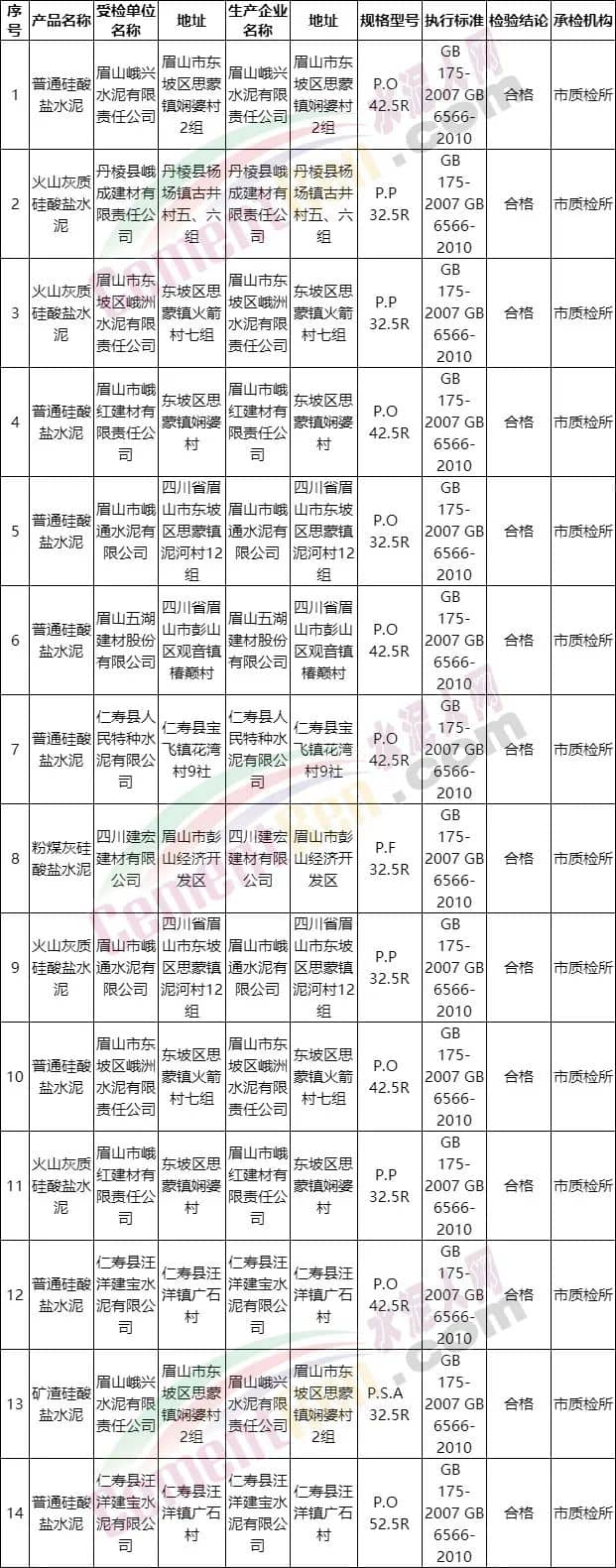 四川省眉山市市場(chǎng)監(jiān)督管理局第四批工業(yè)產(chǎn)品質(zhì)量市級(jí)監(jiān)督抽查共抽查水泥14批次,全部合格。