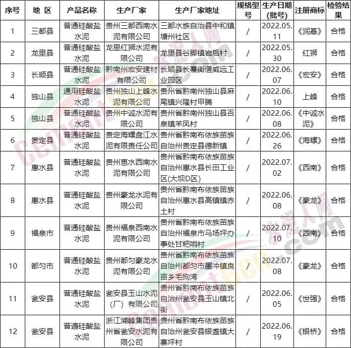 貴州省黔南州市場(chǎng)監(jiān)管局生產(chǎn)領(lǐng)域產(chǎn)品質(zhì)量州級(jí)監(jiān)督抽查,共抽檢12批次水泥,全部合格。