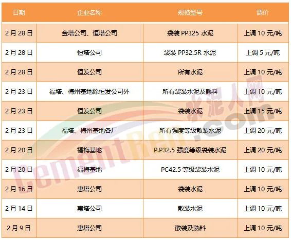 2月23日:福塔、梅州基地除恒發(fā)公司外其余生產(chǎn)企業(yè)所有袋裝水泥及熟料出廠結(jié)算價格分別在現(xiàn)行價格基礎(chǔ)上上調(diào)10元/噸;恒發(fā)公司袋裝水泥出廠結(jié)算價格分別在現(xiàn)行價格基礎(chǔ)上上調(diào)15元/噸;福塔、梅州基地各廠所有強度等級散裝水泥出廠結(jié)算價格分別在現(xiàn)行價格基礎(chǔ)上上調(diào)20元/噸。