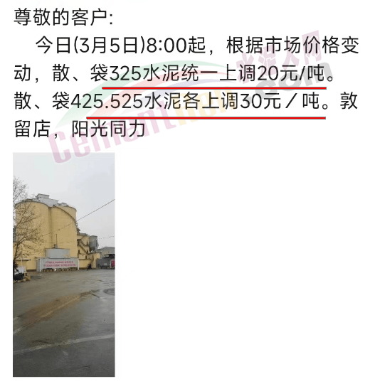 日前,河南區(qū)域陽(yáng)光同力通知3月5日8時(shí)起,根據(jù)市場(chǎng)價(jià)格變動(dòng),散、袋32.5水泥統(tǒng)一上調(diào)20元/噸。散、袋42.5、52.5水泥各上調(diào)30元/噸。