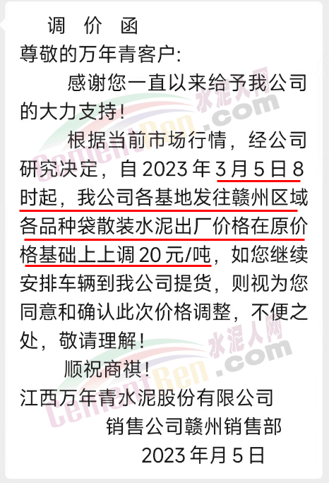 江西萬(wàn)年青水泥贛州銷售部通知,根據(jù)當(dāng)前市場(chǎng)行情,經(jīng)公司研究決定,自2023年3月5日8時(shí)起,各基地發(fā)往贛州區(qū)域各品種袋散裝水泥出廠價(jià)格在原價(jià)格基礎(chǔ)上上調(diào)20元/噸。