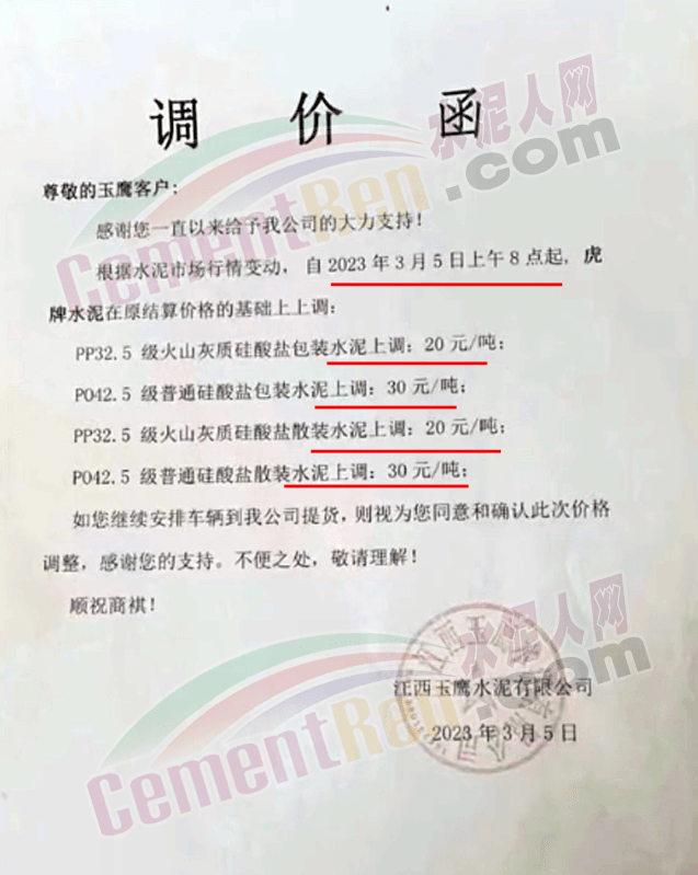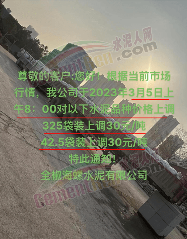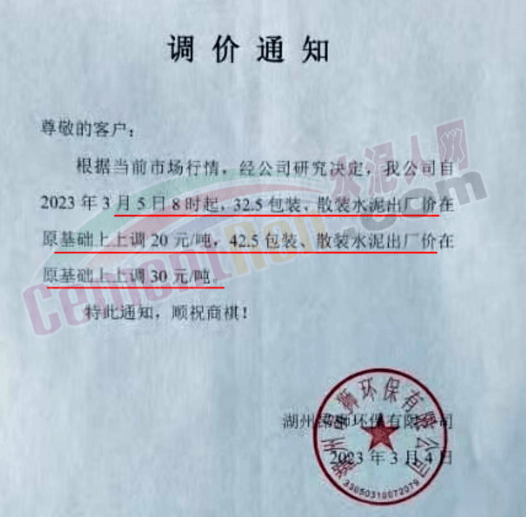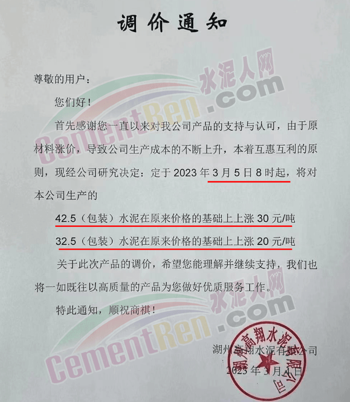 湖州高翔水泥有限公司通知,由于原材料漲價(jià),導(dǎo)致公司生產(chǎn)成本的不斷上升,本著互惠互利的原則,現(xiàn)經(jīng)公司研究決定,于2023年3月5日8時(shí)起,將對(duì)本公司生產(chǎn)的42.5(包裝)水泥在原來(lái)價(jià)格的基礎(chǔ)上上漲 30元/噸,325(包裝)水泥在原來(lái)價(jià)格的基礎(chǔ)上上漲20元/噸。