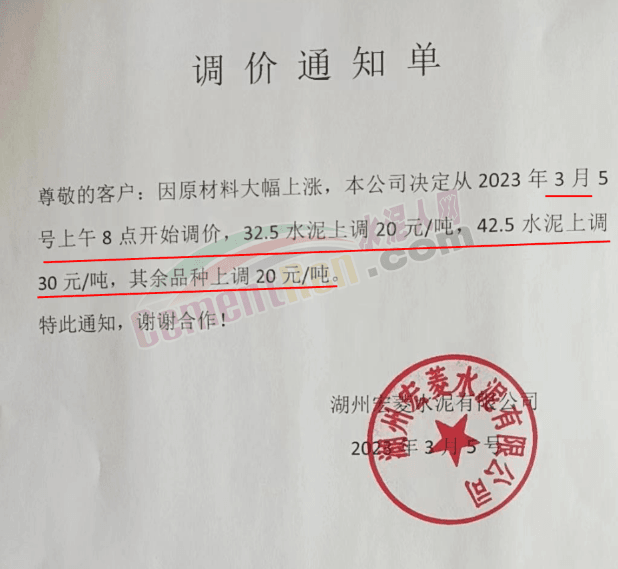 浙江湖州宏菱水泥通知,因原材料大幅上漲,公司決定從2023 年3月5號(hào)上午8點(diǎn)開(kāi)始調(diào)價(jià),32.5水泥上調(diào) 20元/噸,42.5水泥上調(diào)30元/噸,其余品種上調(diào)20元/噸。