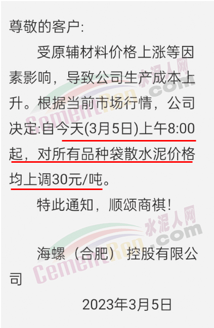 海螺(合肥)控股有限公司通知,受原輔材料價(jià)格上漲等因素影響,導(dǎo)致公司生產(chǎn)成本上升。根據(jù)當(dāng)前市場(chǎng)行情,公司決定,自3月5日上午8時(shí)起,對(duì)所有品種袋散水泥價(jià)格均上調(diào)30元/噸。