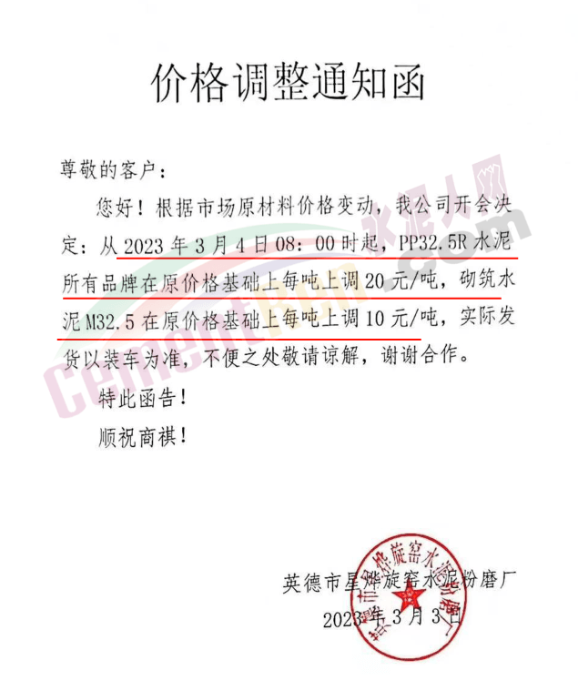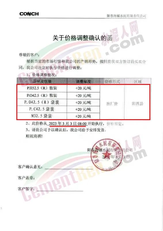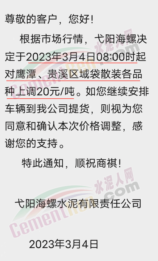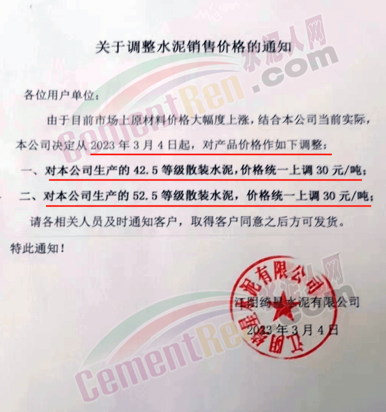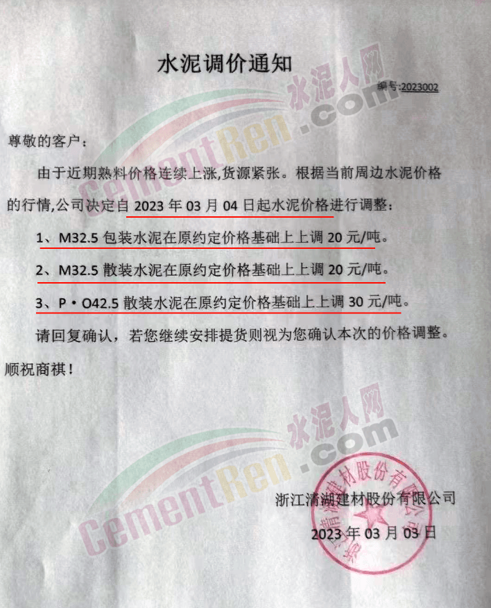 高安紅獅水泥銷售服務(wù)科通知,根據(jù)當(dāng)前市場行情,經(jīng)公司研究決定,自2023年3月3日上午7時(shí)起,高安紅獅水泥有限公司對南昌片區(qū)紅獅牌42.5散裝上調(diào)30元/噸,其他片區(qū)紅獅牌、錢江牌各規(guī)格品種水泥合同價(jià)上調(diào)20元/噸。