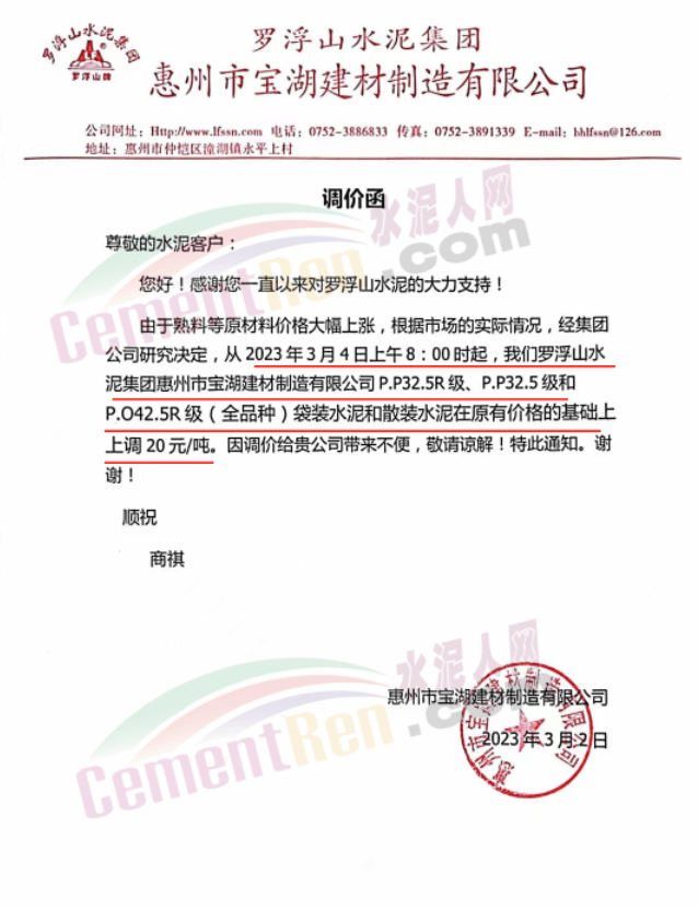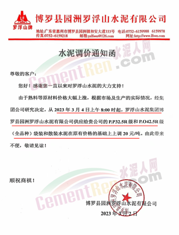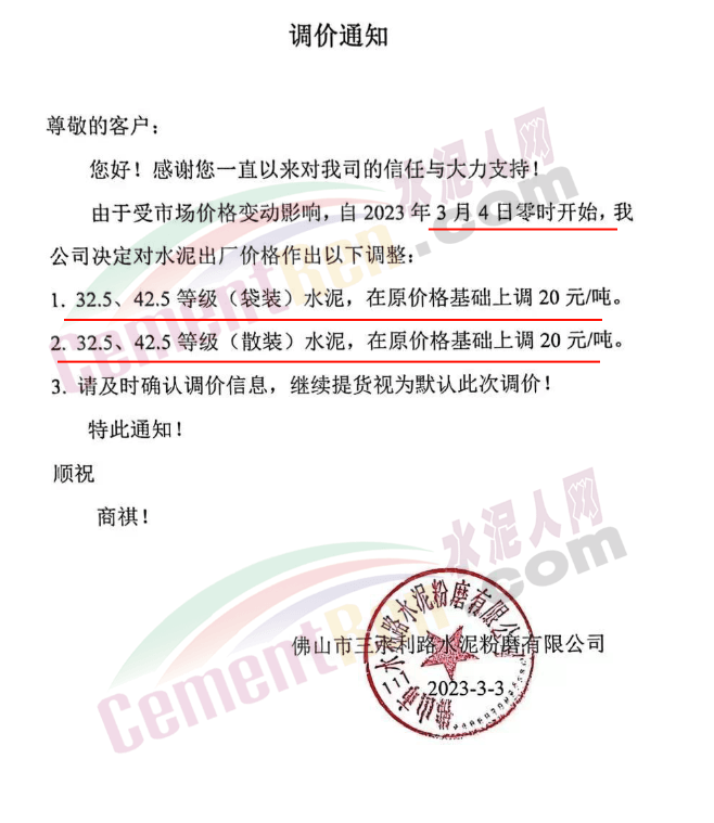 佛山市三水利路水泥粉磨有限公司通知,3月4日零時(shí)開始各標(biāo)號水泥上調(diào)20元/噸。