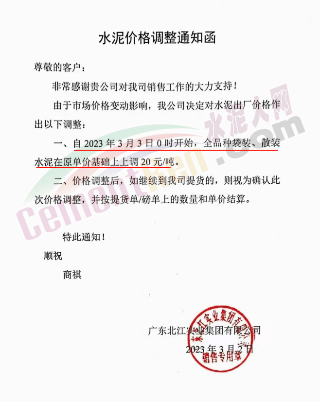 廣東北江實(shí)業(yè)集團(tuán)有限公司通知,由于市場價(jià)格變動影響,公司決定自3月3日0時(shí)開始全品種水泥上調(diào)20元/噸。