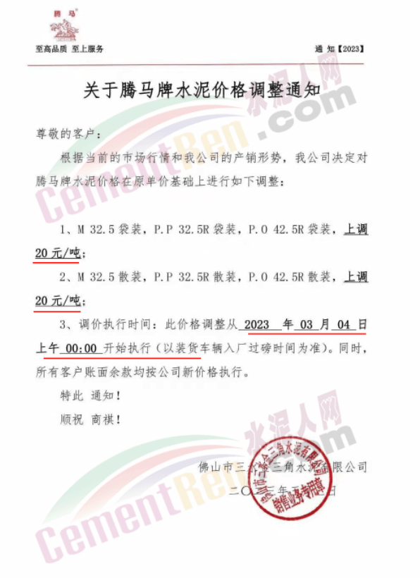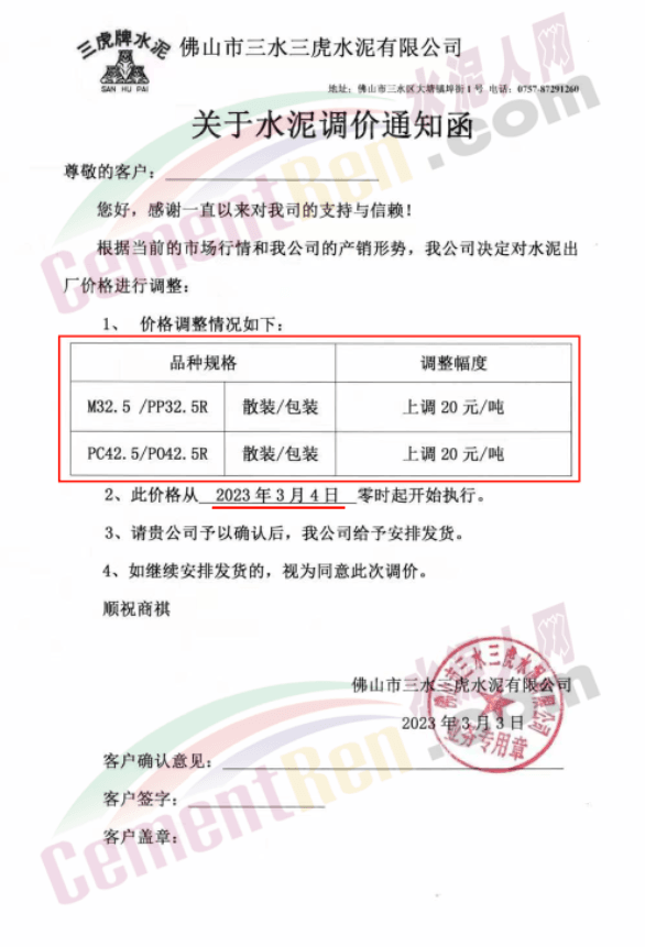佛山市三水三虎水泥通知,3月4日零時(shí)起各標(biāo)號水泥上調(diào)20元/噸。
