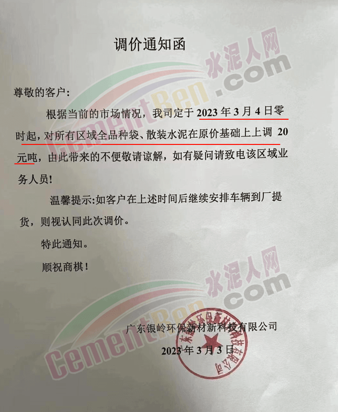 廣東銀嶺環(huán)保新材料科技有限公司通知,3月4日對全區(qū)域水泥價(jià)格上調(diào)20元/噸。