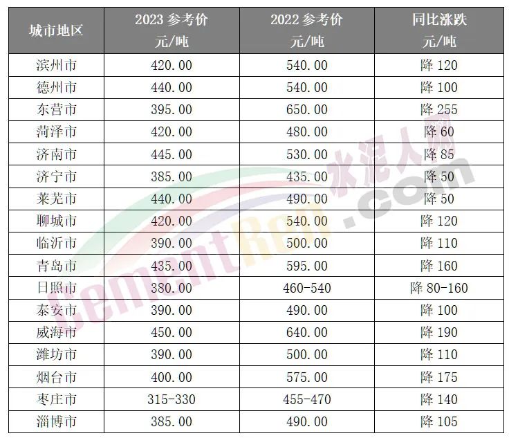 水泥人網(wǎng)信息中心數(shù)據(jù)顯示,山東東營水泥價(jià)格較上年同期大跌255元/噸,威海、煙臺水泥價(jià)格跌190元/噸、170元/噸;日照今年3月初較上年同期報(bào)價(jià)下跌80-160元/噸,棗莊區(qū)域水泥價(jià)格也下跌了140元/噸左右。