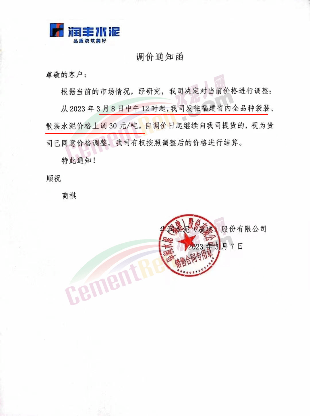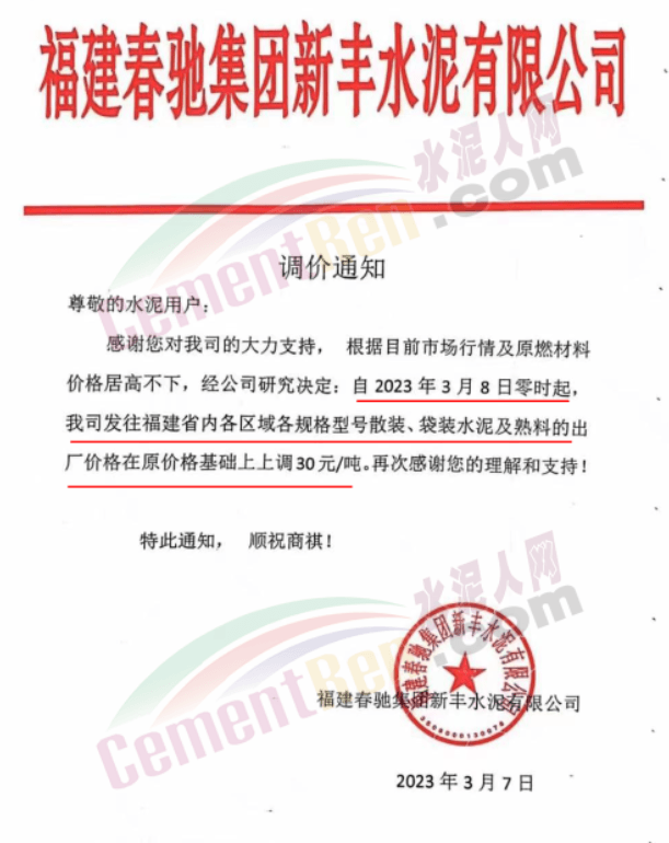 華潤水泥通知,從3月8日中午12時起,公司發(fā)往福建省全品種袋裝、散裝水泥價格上調(diào)30元/噸。