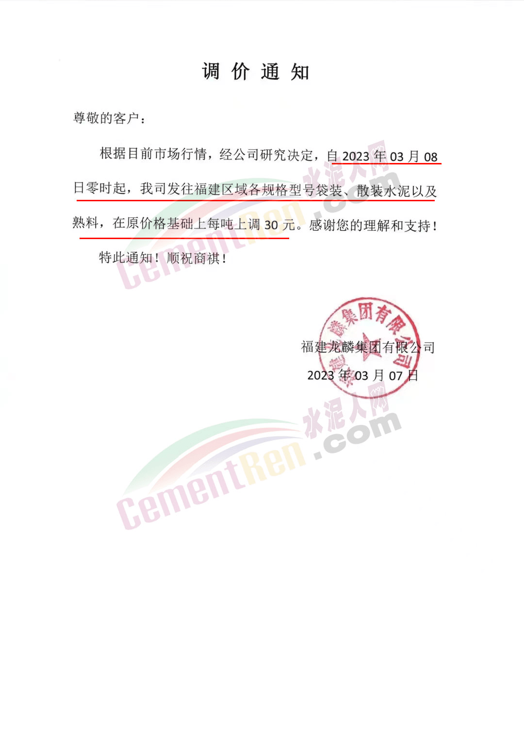 福建龍麟集團有限公司通知,3月8日零時起,發(fā)往福建區(qū)域各規(guī)格型號袋裝、散裝水泥以及熟料在原價基礎(chǔ)上上調(diào)30元/噸。