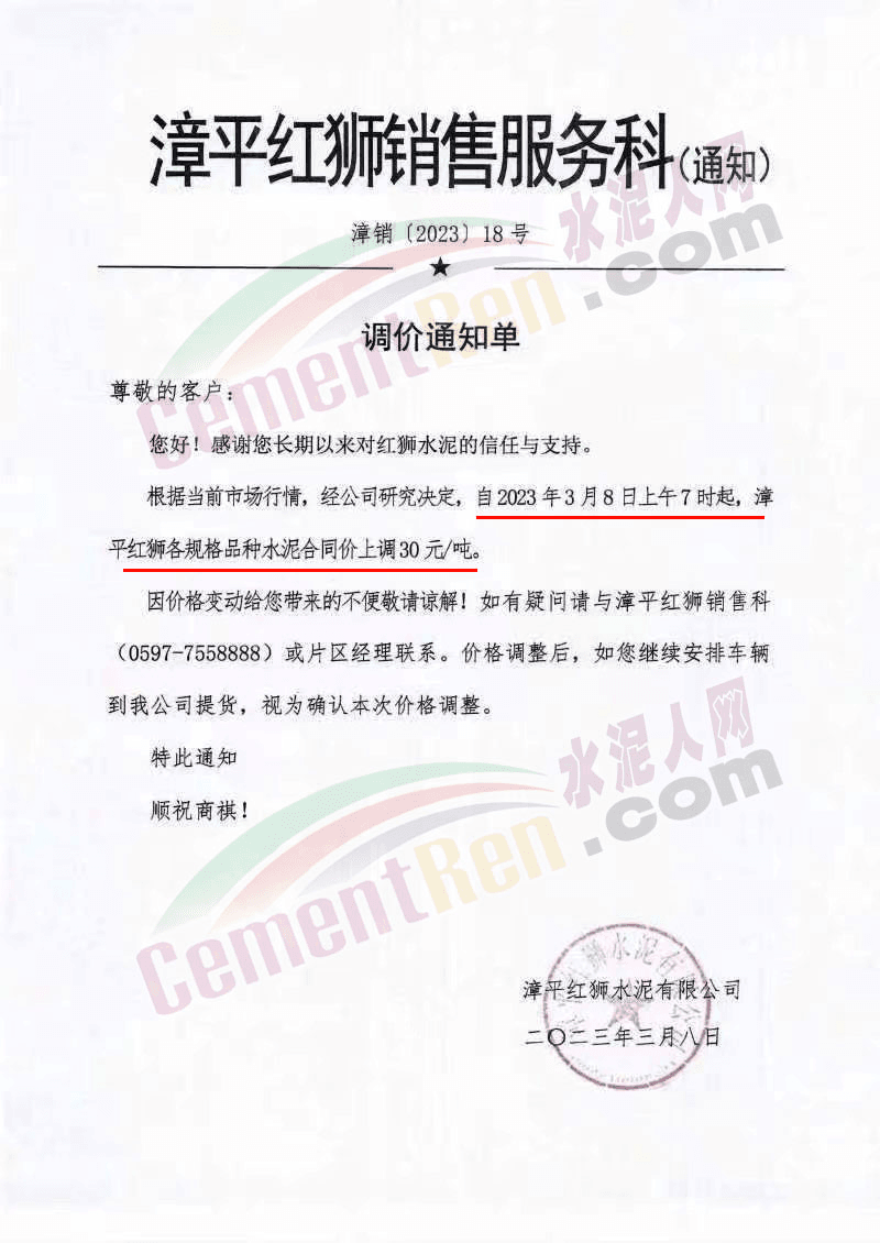漳平紅獅銷售服務(wù)科通知,3月8日上午7時起,各規(guī)格品種水泥合同價上調(diào)30元/噸。