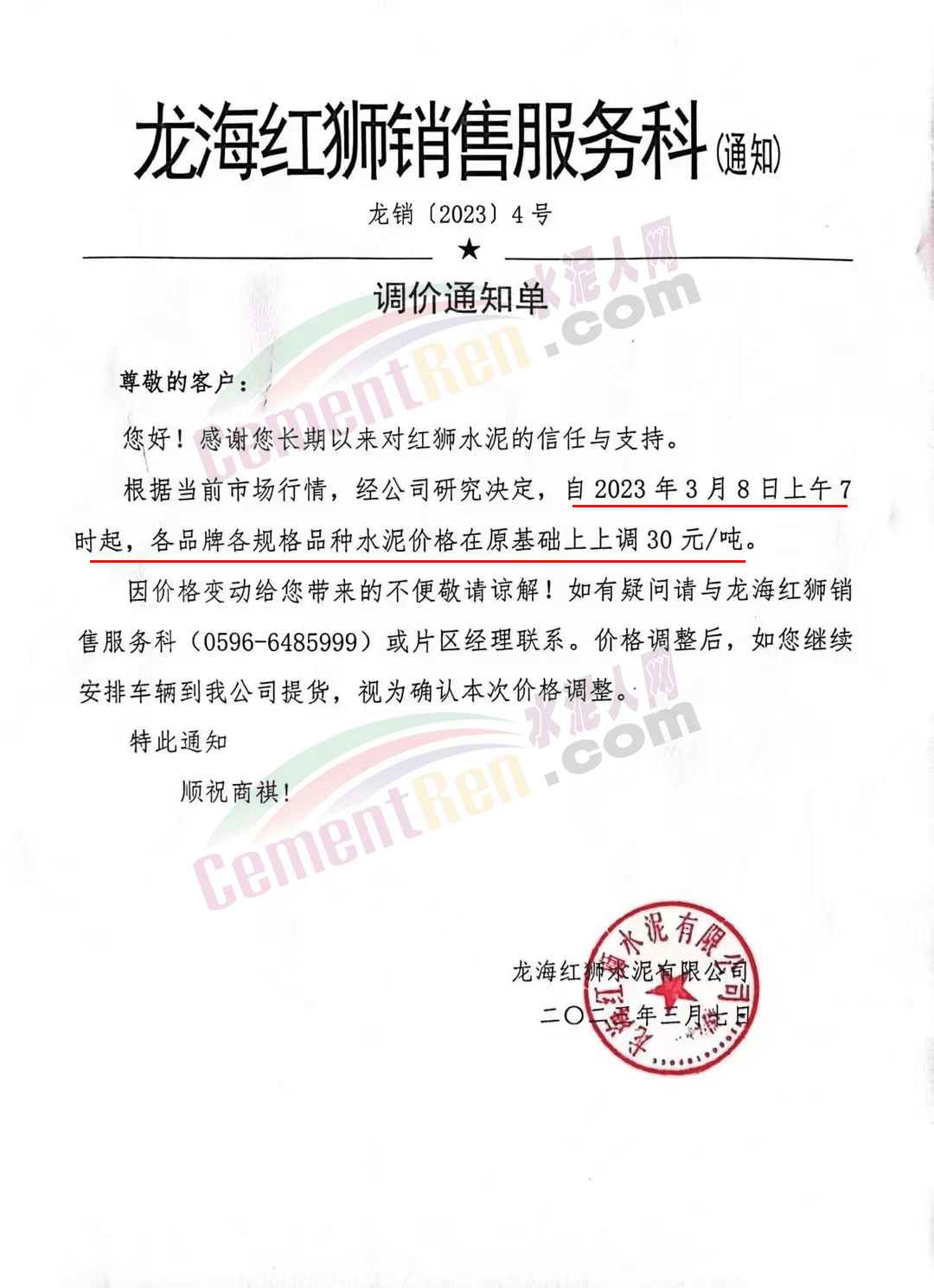 龍海紅獅水泥有限公司通知,3月8日7時起,各品牌各規(guī)格品種水泥價格在原基礎(chǔ)上上調(diào)30元/噸。
