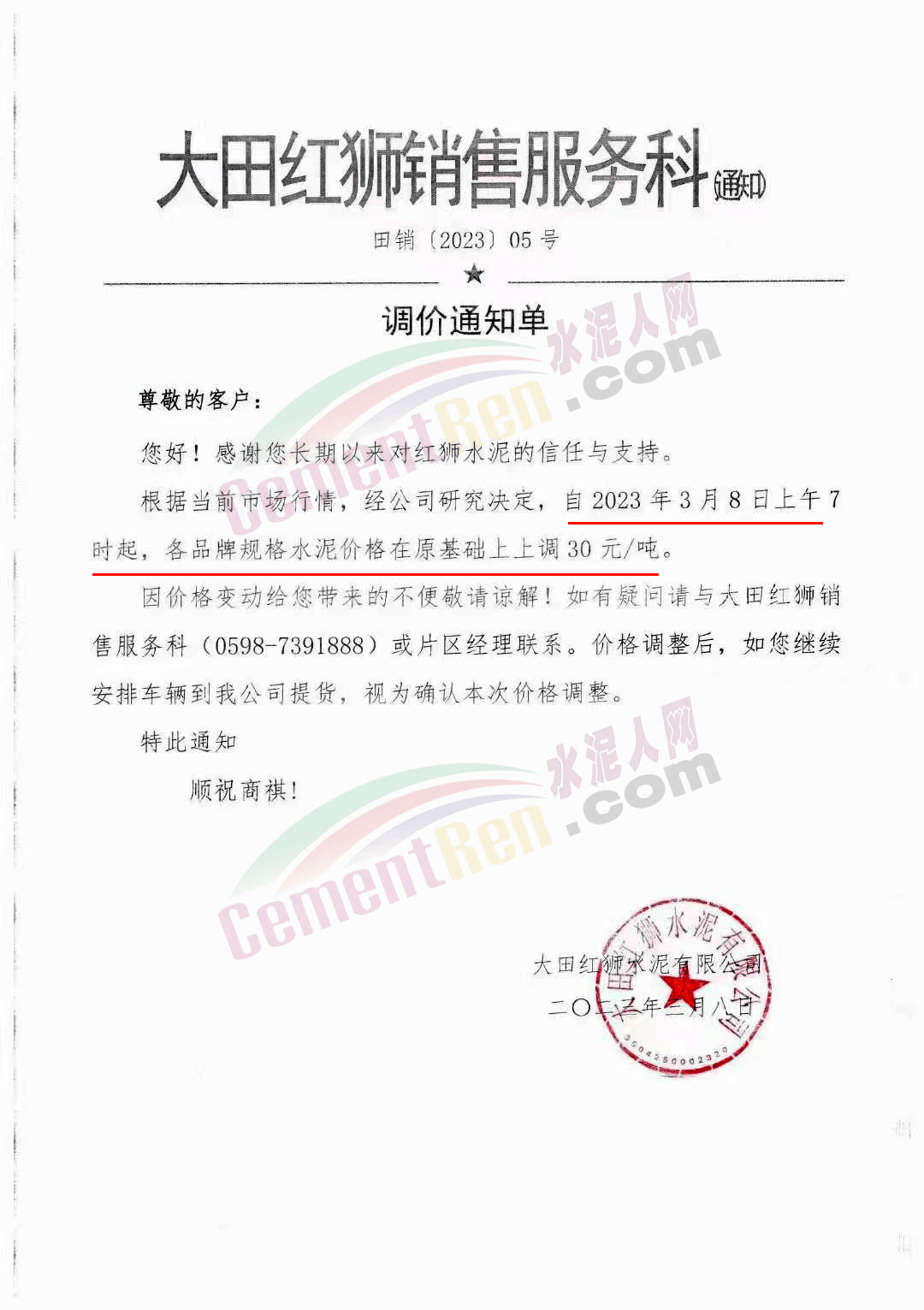 大田紅獅銷售服務(wù)科通知,3月8日上午7時起,各品牌規(guī)格水泥價格在原基礎(chǔ)上上調(diào)30元/噸。