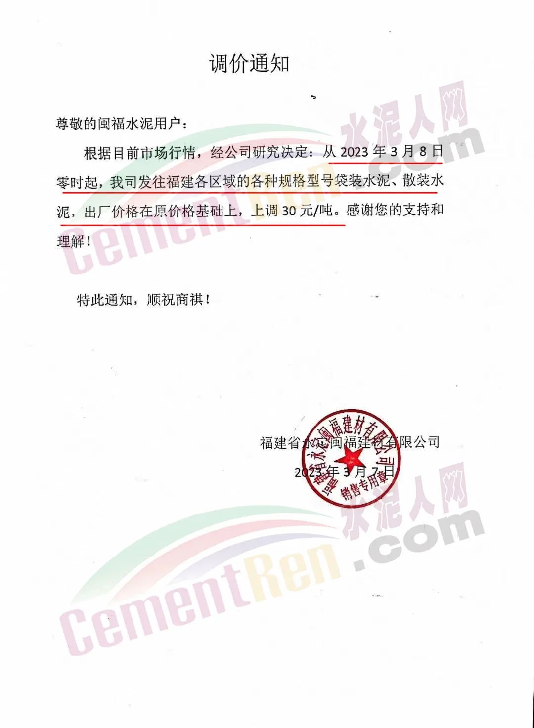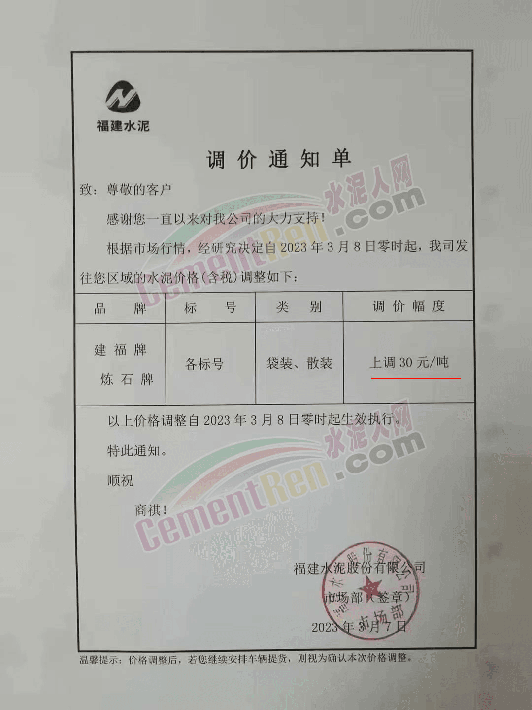 福建金牛水泥有限公司通知,自3月8日上午6時30分起,水泥出廠價上調(diào)30元/噸。