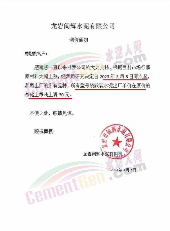 龍巖閩輝水泥有限公司通知,根據(jù)當(dāng)前市場行情 ,原材料大幅上漲,經(jīng)公司研究決定自3月8日零點起,公司出廠的所有品種,所有型號袋散裝水泥出廠單價在原價基礎(chǔ)上每噸上調(diào)30元。