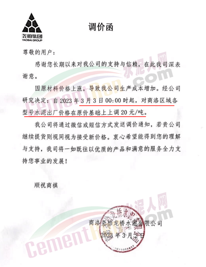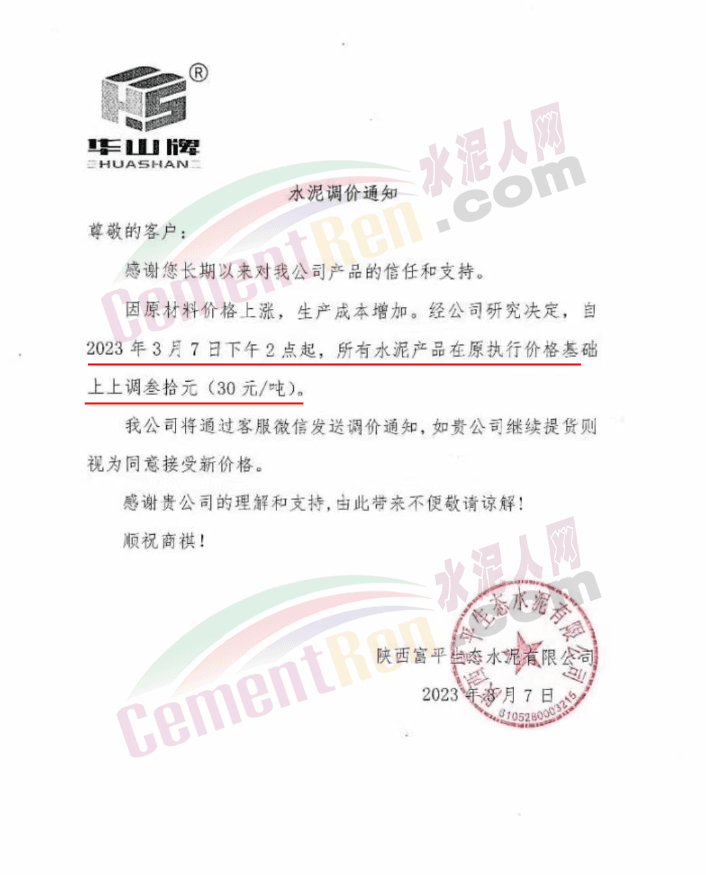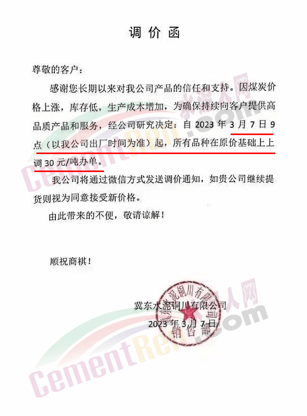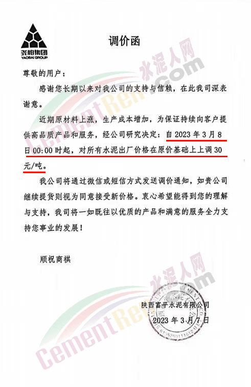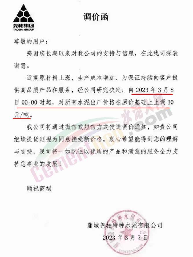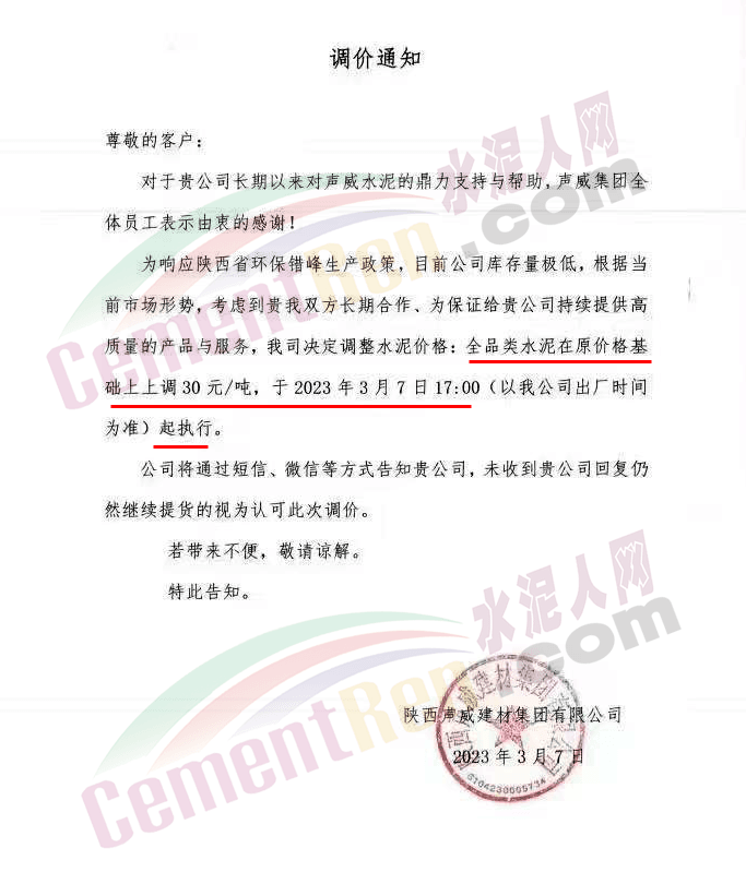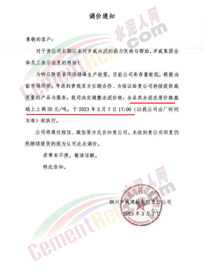 陜西聲威建材集團有限公司、銅川聲威建材有限責(zé)任公司通知稱,為響應(yīng)陜西省環(huán)保錯峰生產(chǎn)政策,目前公司庫存量極低,根據(jù)當(dāng)前市場形勢,于2023年3月7日17時起公司全品類水泥在原價基礎(chǔ)上上調(diào)30元/噸。