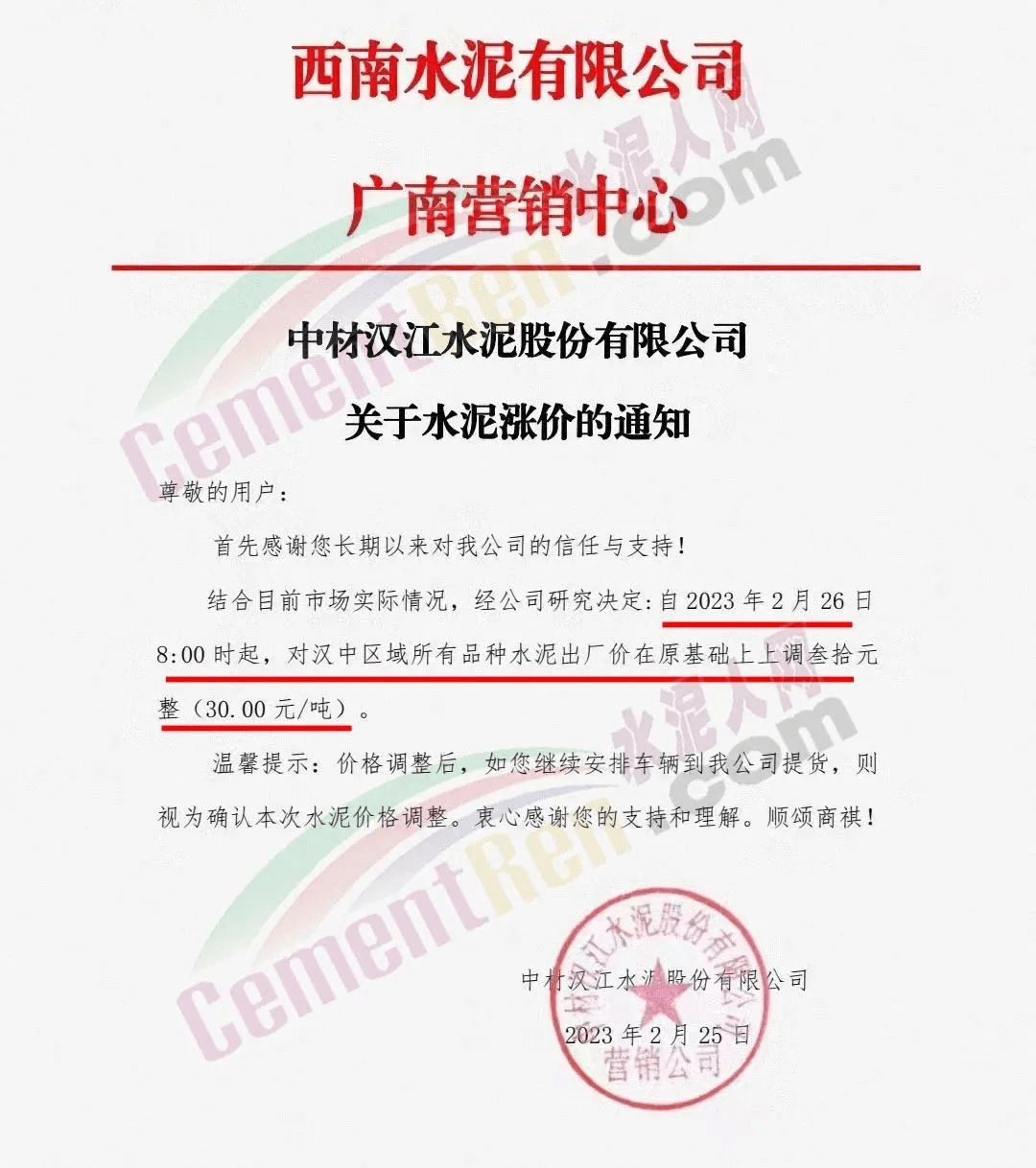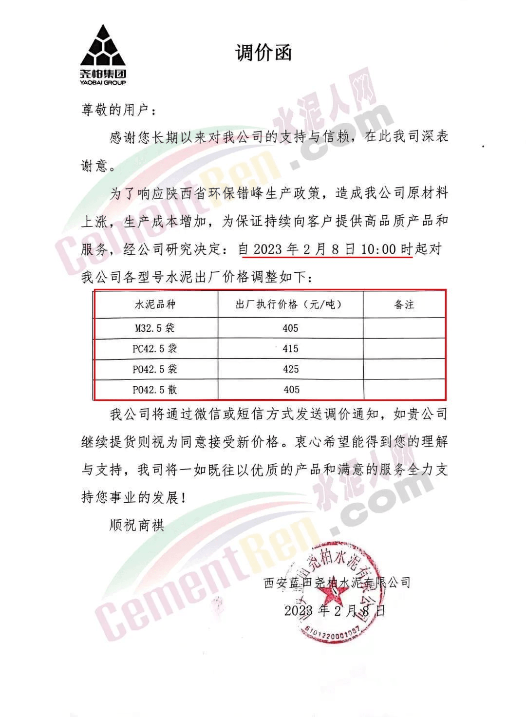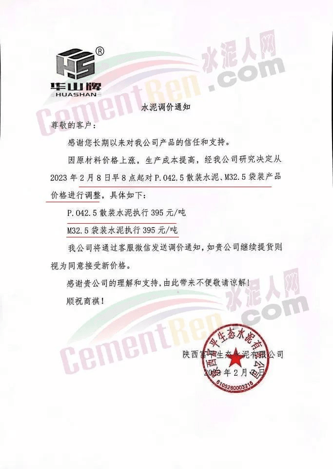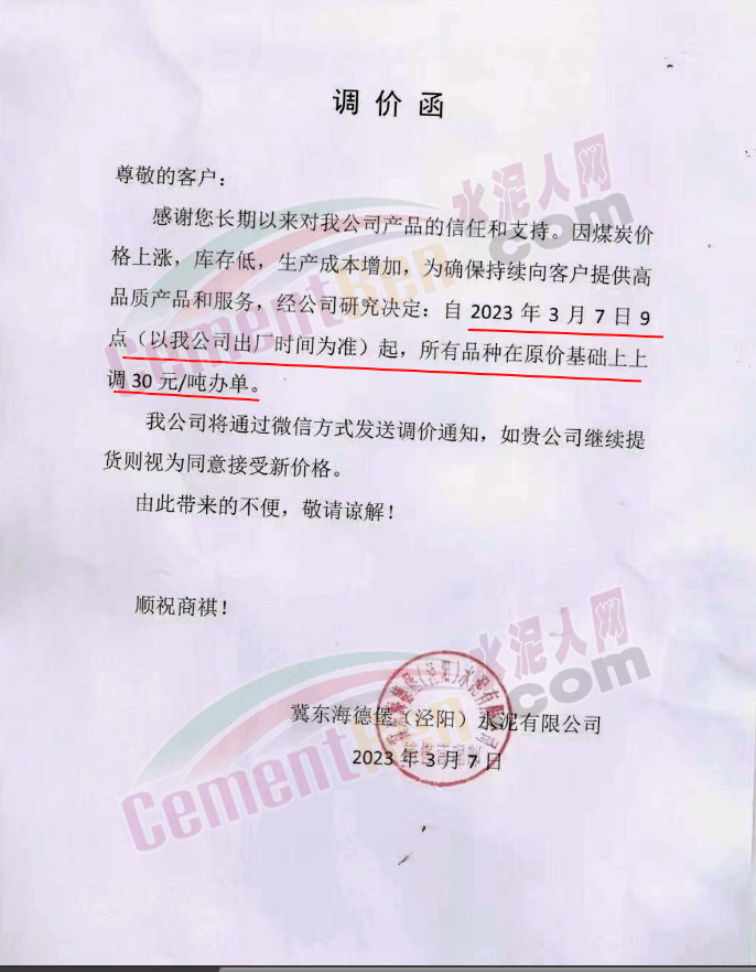 陜西聲威建材集團有限公司、銅川聲威建材有限責(zé)任公司通知稱,為響應(yīng)陜西省環(huán)保錯峰生產(chǎn)政策,目前公司庫存量極低,根據(jù)當(dāng)前市場形勢,于2023年3月7日17時起公司全品類水泥在原價基礎(chǔ)上上調(diào)30元/噸。