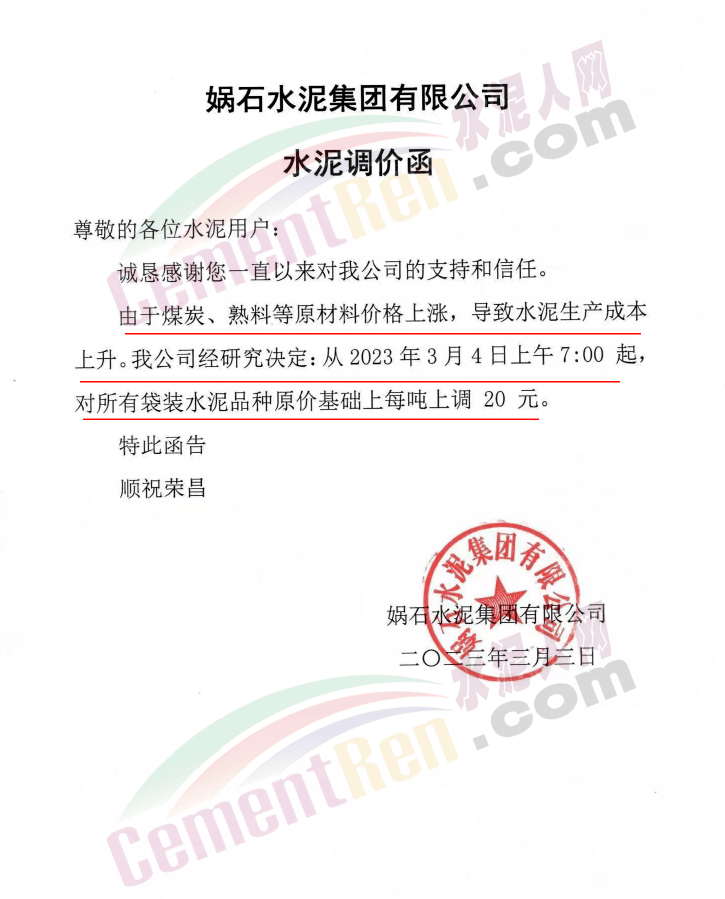 湖北媧石水泥集團有限公司此前通知所有袋裝水泥品種在原價基礎(chǔ)上上調(diào)20元/噸。