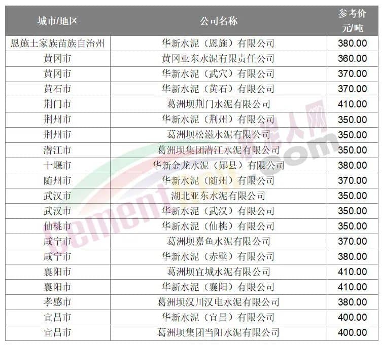 水泥人網(wǎng)信息中心數(shù)據(jù)顯示,近期湖北各區(qū)域P.O42.5散裝水泥報價在340-410元/噸左右。武漢兩家主要品牌企業(yè)華新水泥、亞東水泥報價350元/噸,黃石大冶尖峰和華新水泥分別報價350元/噸和370元/噸。從湖北各區(qū)域主要品牌企業(yè)報價來看,華新、葛洲壩、亞東水泥近期報價基本一致,差價相對較小。