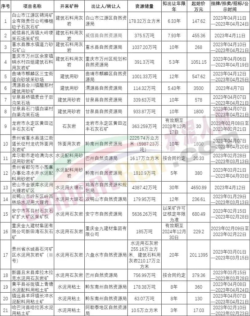 沒有礦山就沒有成本優(yōu)勢(shì),所謂得礦山者得市場(chǎng),在激烈的市場(chǎng)競(jìng)爭(zhēng)中自有礦山被水泥企業(yè)認(rèn)定為實(shí)力的象征。據(jù)水泥人網(wǎng)不完全統(tǒng)計(jì),近期自然資源部公告掛牌出讓的21個(gè)礦山項(xiàng)目,擬出讓采礦權(quán)的礦山項(xiàng)目中出讓年限中最長(zhǎng)的達(dá)30年,起始價(jià)達(dá)4650.89萬元。