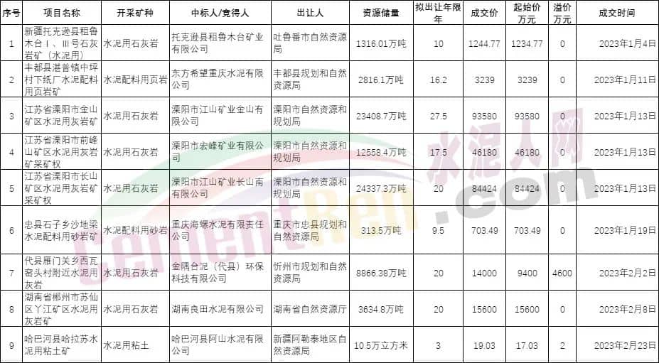 已成交9宗礦山競(jìng)得企業(yè)包含重慶海螺水泥有限責(zé)任公司、金隅臺(tái)泥(代縣)環(huán)??萍加邢薰?、湖南良田水泥有限公司、東方希望重慶水泥有限公司等水泥行業(yè)知名企業(yè)。