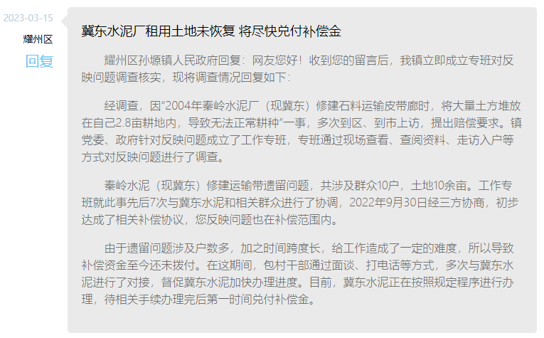 秦嶺水泥(現冀東)修建運輸帶遺留問題,共涉及群眾10戶,土地10余畝。工作專班就此事先后7次與冀東水泥和相關群眾進行了協(xié)調,2022年9月30日經三方協(xié)商,初步達成了相關補償協(xié)議,網友反映問題也在補償范圍內。