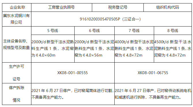 據了解,早在2021年9月26日銅川市人民政府就發(fā)布了《關于冀東水泥銅川有限公司5、6、7、8號 生產線停產拆除的公告》公告提到,經實地核查,冀東水泥銅川有限公司新建的萬噸水泥熟料生產線已于2021年6月28日點火投產,該公司產能置換后5、6號生產線2021年6月27日停產,已對窯尾筒體進行切割,不具備再生產能力。7、8號生產線2021年6月27日停產,已對窯傳動系統(tǒng)電機和減速機進行拆除,不具備再生產能力。