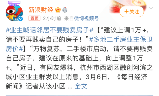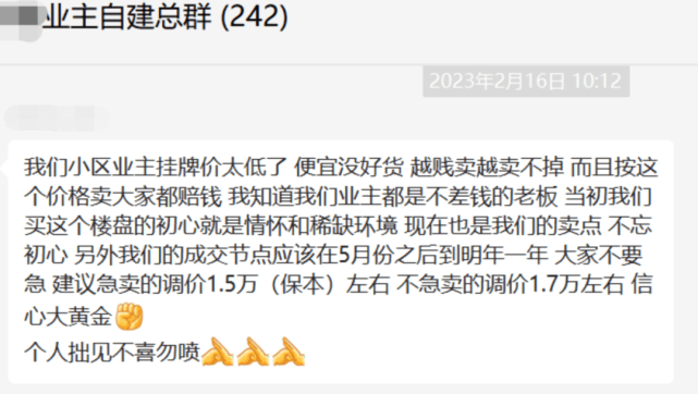 浙江杭州某個(gè)高端小區(qū)的小區(qū)業(yè)主呼吁:“萬物復(fù)蘇,二手樓市啟動(dòng),請(qǐng)不要再賤賣自己房子,建議在原來的基礎(chǔ)上,向上調(diào)整1萬+”。
