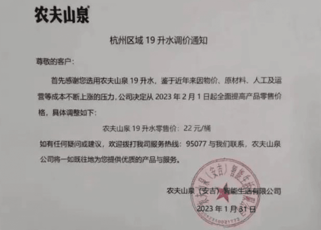 農(nóng)夫山泉自2022年上海將農(nóng)夫山泉19L天然水零售價(jià)由26元/桶調(diào)整到28元/桶后,今年1月杭州將每桶增加了2元的價(jià)格,漲幅10%。